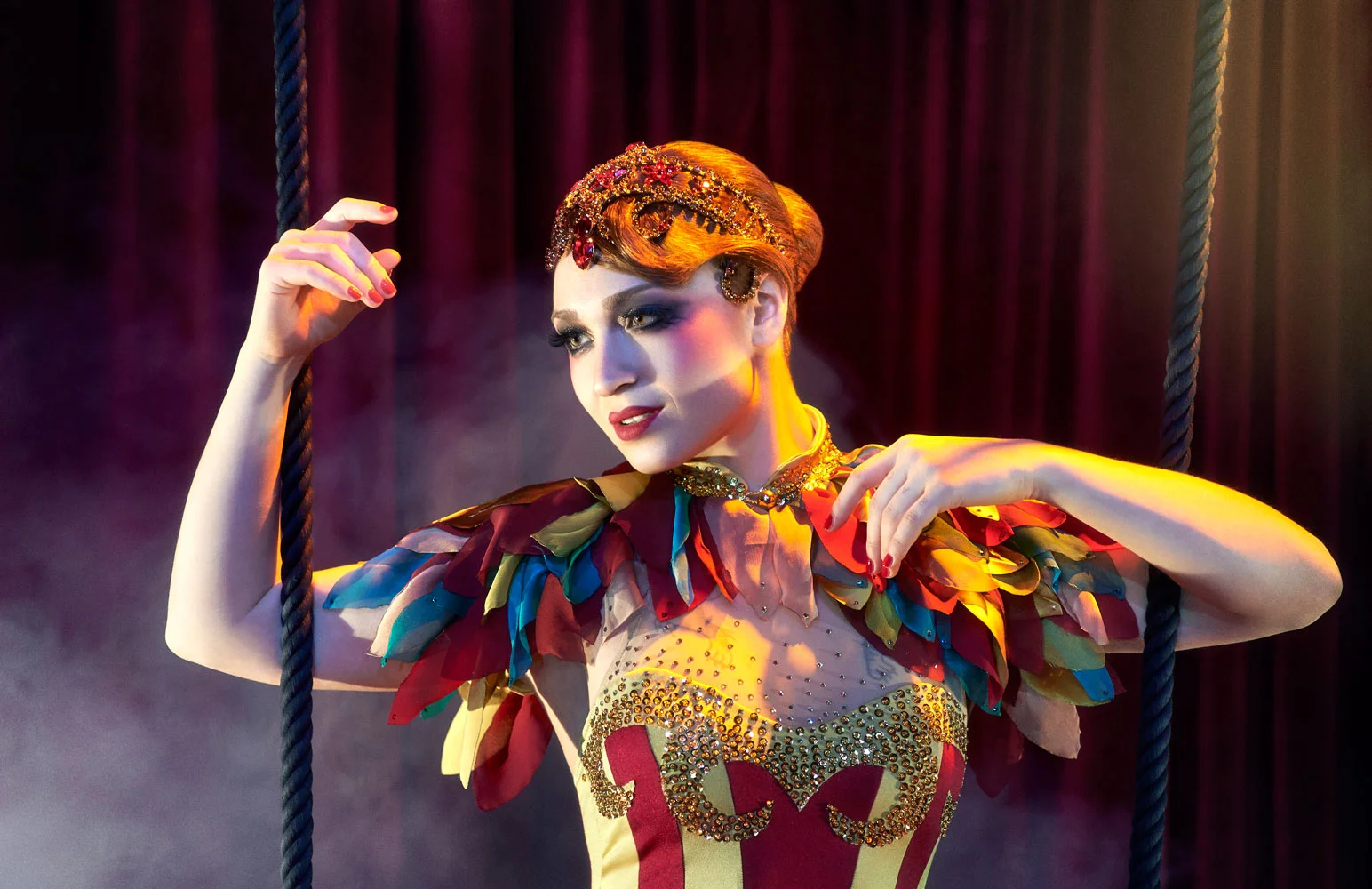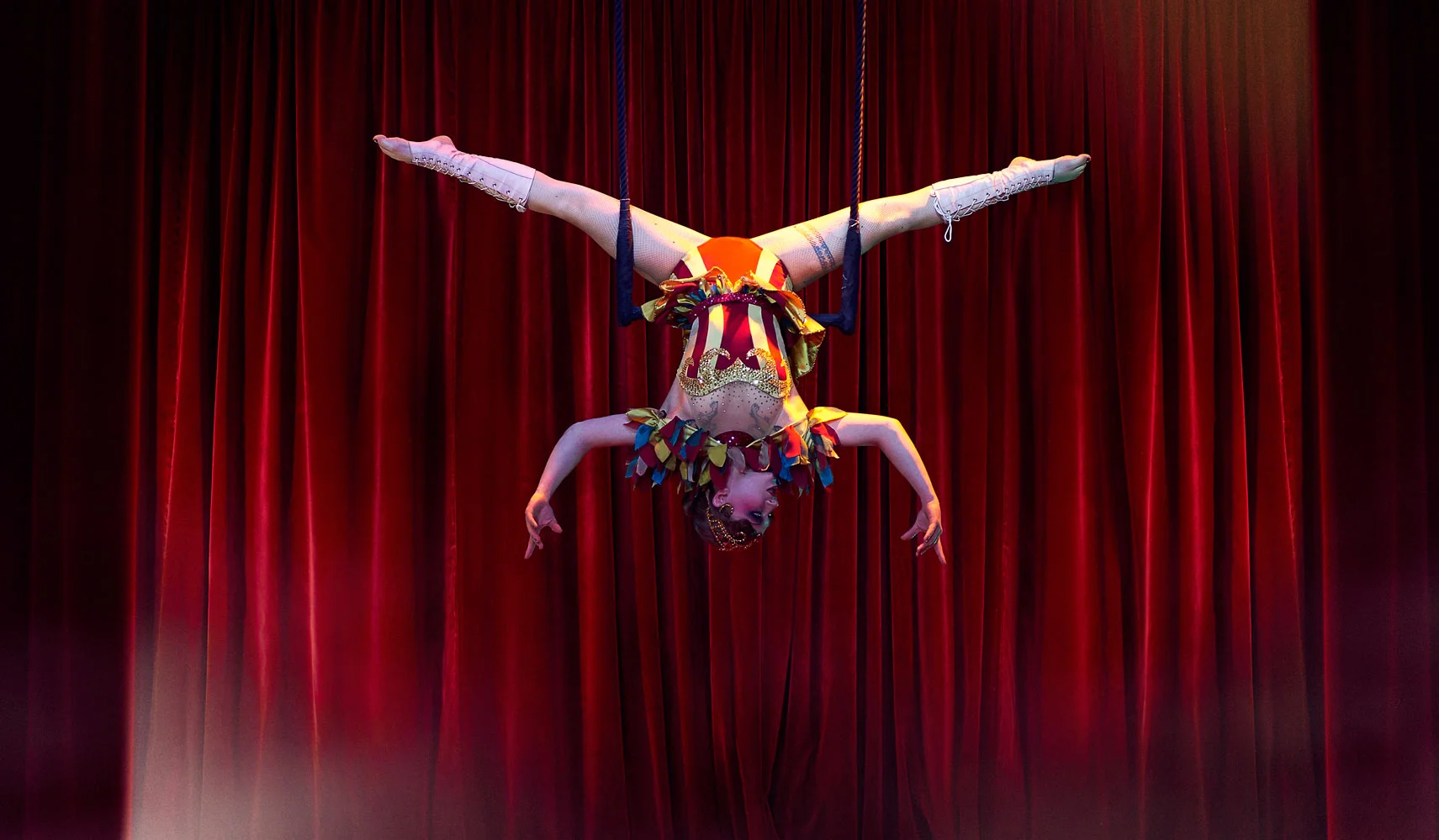 Janet Fischietto acting "Trapeze Folies", burlesque and circus become a unique sensational experience!